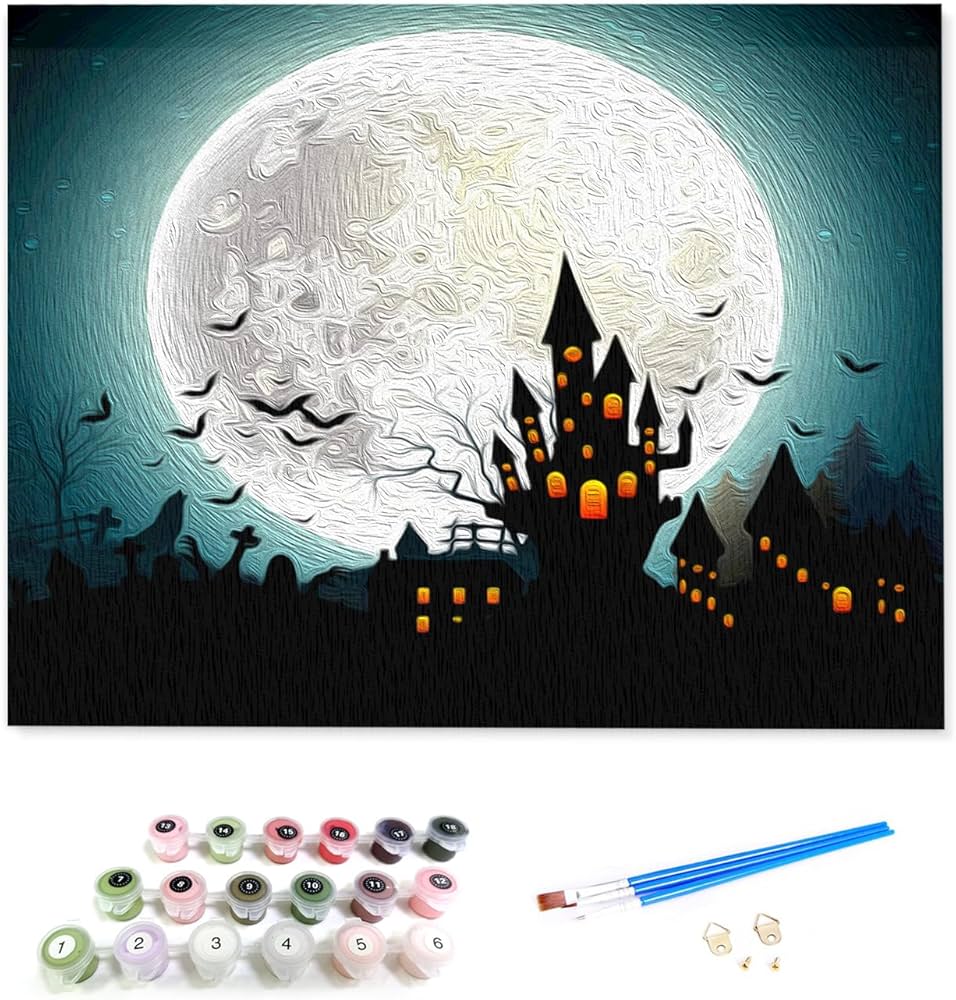 Amazon Com Paint By Numbers For Adults Without Frame Halloween Scary Castle Bat Grave Full Moon At Night Paint By Numbers Kits On Canvas Diy Acrylic Painting For Kids Beginner 12 X16